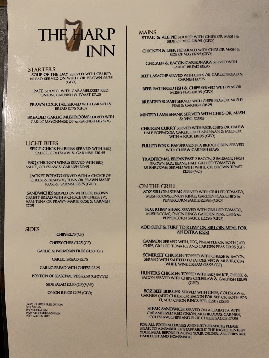 The menu at The Harp Inn boasts a wide selection of dishes made from fresh ingredients, served in generous portions that satisfy both appetite and comfort. From classic prawn cocktails to hearty beef dinners, every plate arrives quickly and hot, reflecting the kitchen’s dedication to quality and consistency. The homemade chips accompanying many meals add a perfect rustic touch, enhancing the overall flavor balance. The pub’s beer selection complements the food expertly, featuring an array of beers, wines, and spirits that cater to diverse tastes without overwhelming the palate.